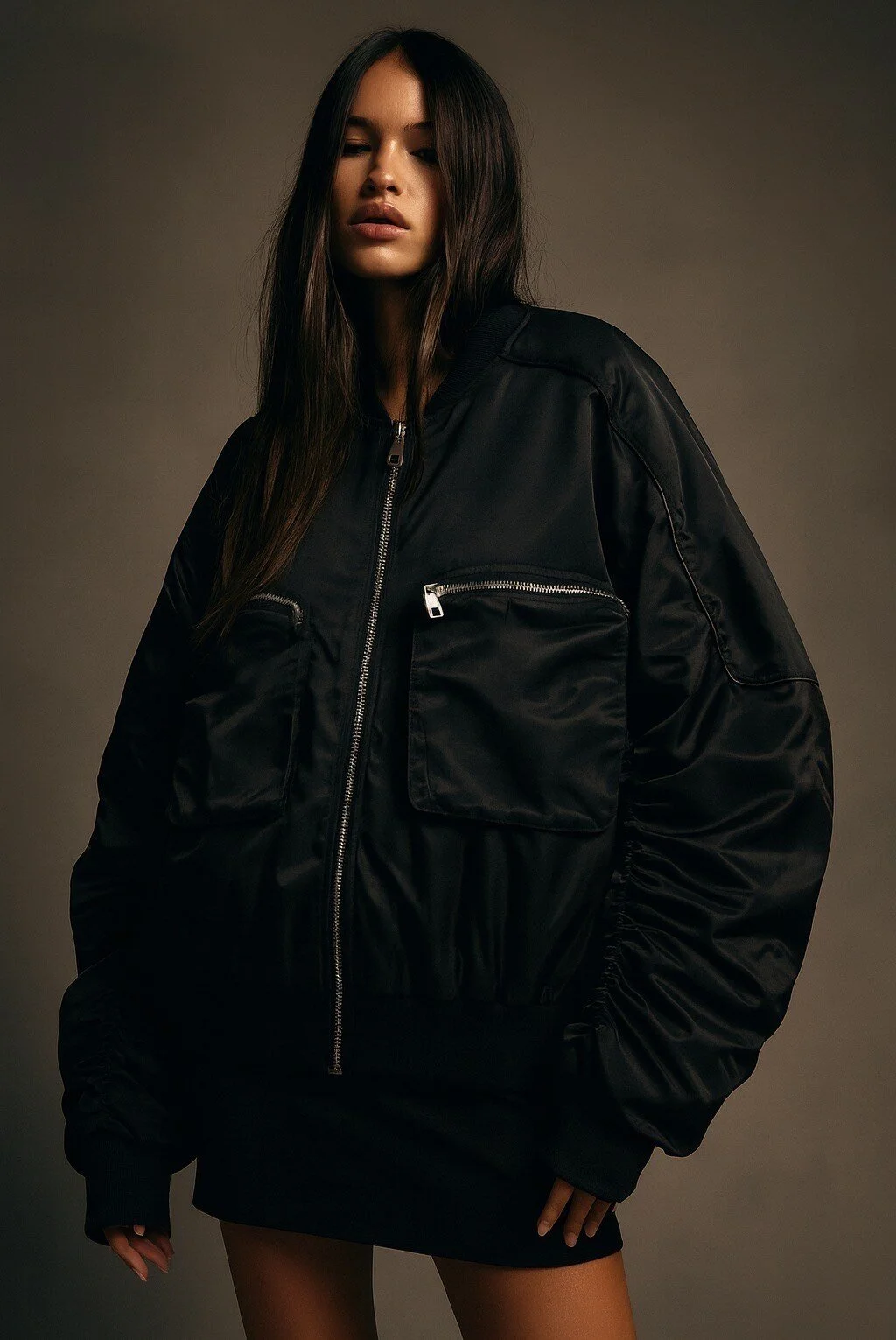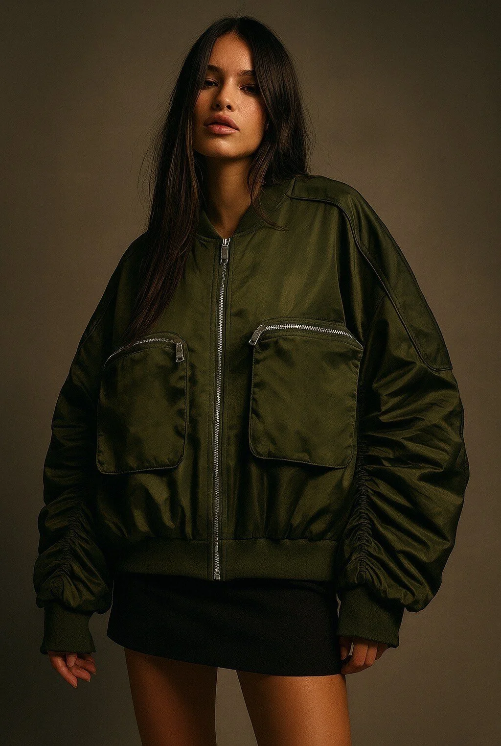 Oversize-mallinen bomber-takki, jossa on selkeästi korostetut, runsaat hihat ja sporttinen mutta ylellinen ilme. Takki on valmistettu kevyesti kiiltävästä, sileäpintaisesta materiaalista, joka antaa sille modernin ja hieman futuristisen sävyn. Edessä on täyspitkä vetoketju sekä kaksi suurta, näyttävää etutaskua vetoketjuyksityiskohdin. Ryppydetalliset hihat tuovat volyymia ja asenteellisuutta, kun taas joustavat resorit helmassa ja hihansuissa täydentävät bomber-tyylistä siluettia. Malli on väljä ja laatikkomainen, mikä tekee takista trendikkään ja helposti kerrostettavan.