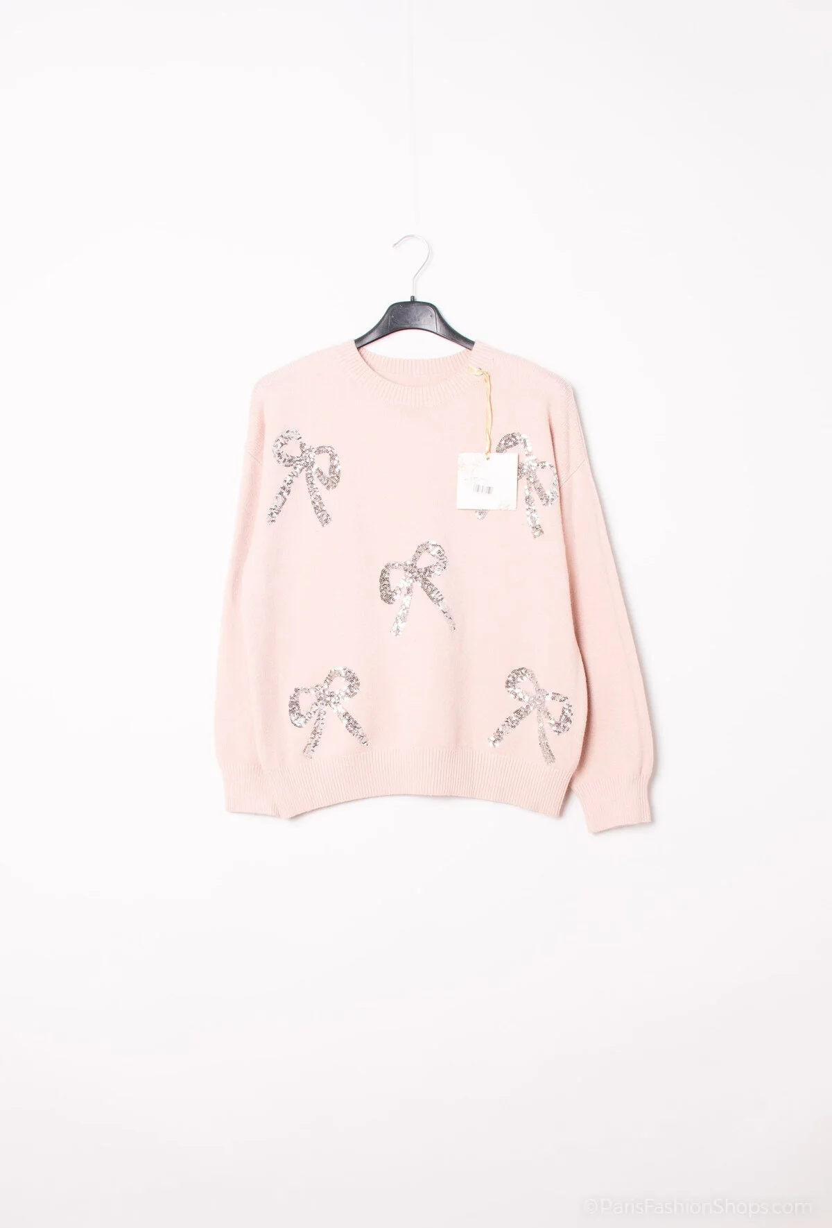 Ihastuttava, pehmeä neulepusero, jossa on elegantti ja leikkisä ilme. Neuleen vaalea sävy tuo raikkautta, kun taas etupuolta koristavat useat kimaltavat paljettirusetit lisäävät näyttävyyttä ja juhlavuutta. Rentona laskeutuva malli ja pyöreä pääntie tekevät puserosta helpon ja mukavan käyttää arjessa tai juhlassa.