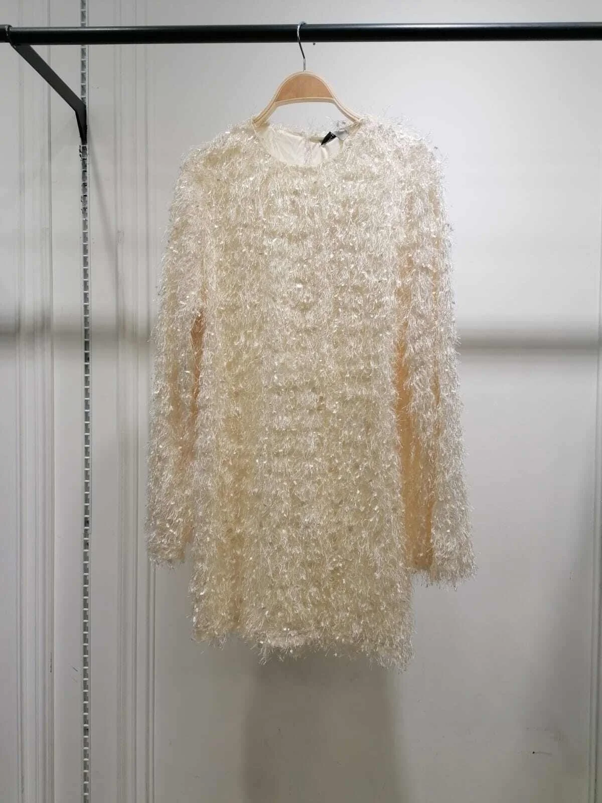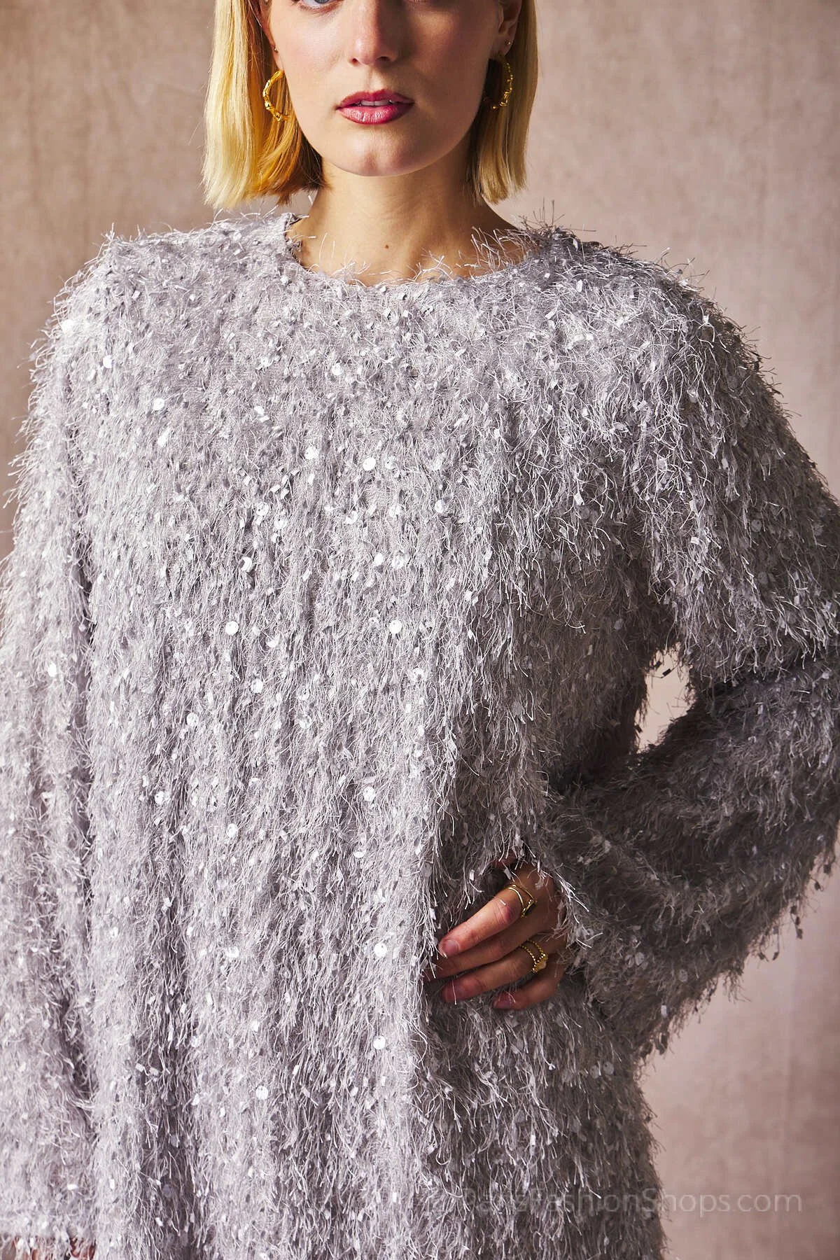 Tämä harmaa, pehmeästi hohtava minimekko on täydellinen yhdistelmä mukavuutta ja näyttävyyttä. Mekko on valmistettu teksturoidusta “fuzzy”-materiaalista, joka luo eläväisen ja upean struktuurin koko asuun. Väljä, suoralinjainen leikkaus tekee siitä rennon, mutta samalla trendikkään valinnan. Pitkät hihat ja pyöreä pääntie tuovat tasapainoa muuten näyttävälle pinnalle.