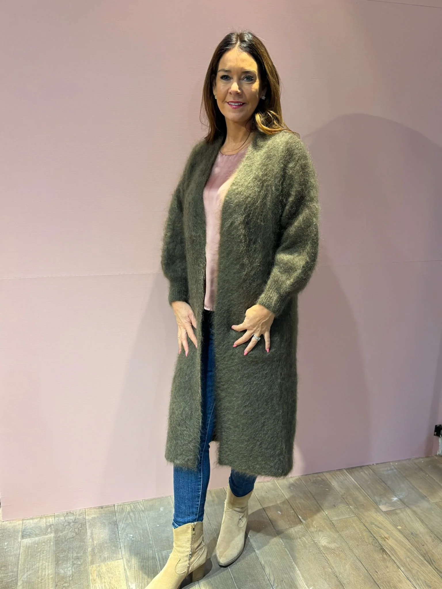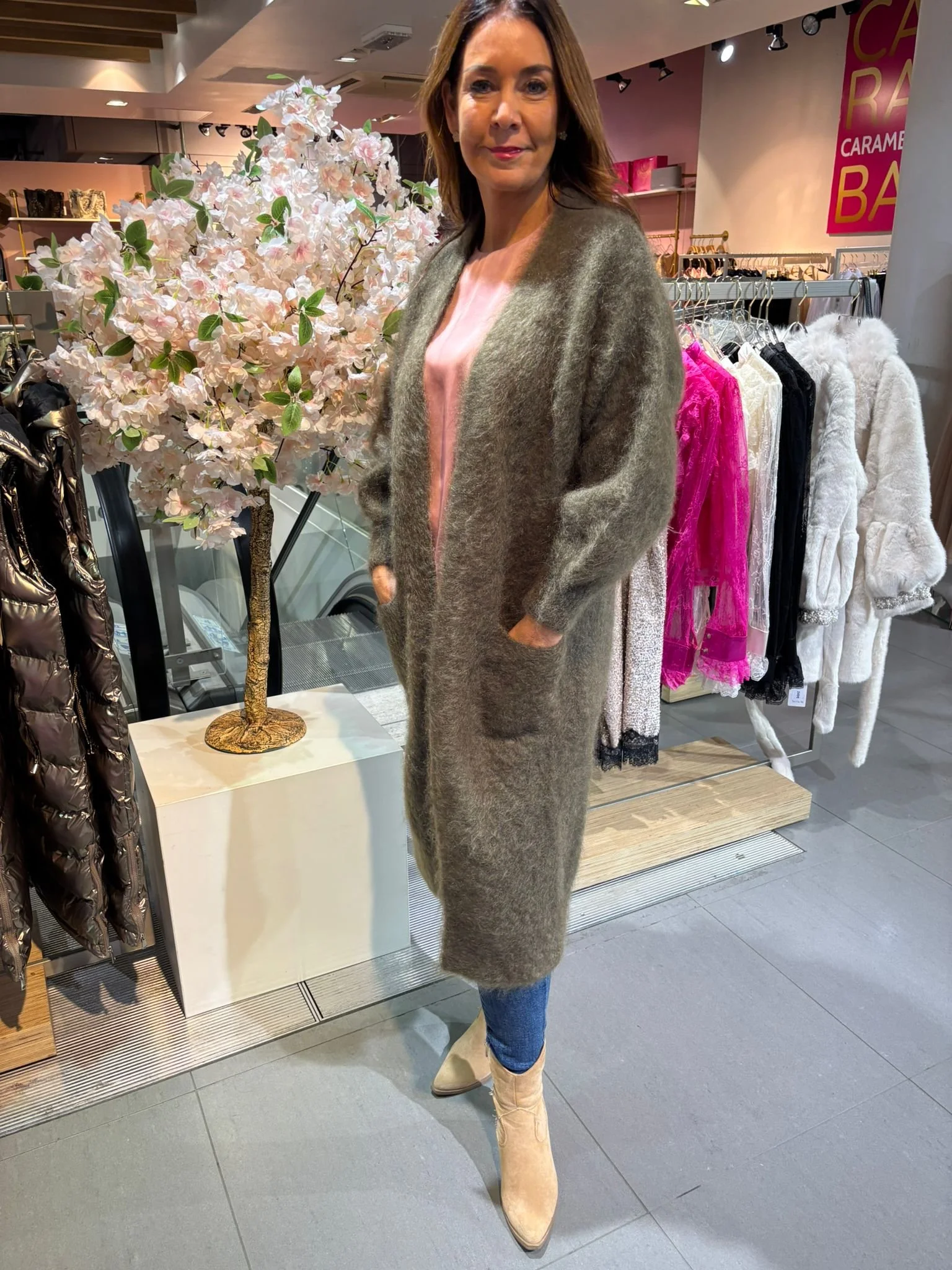 Upea, pitkä mohair-neuletakki on täydellinen yhdistelmä ylellisyyttä ja mukavuutta. Pehmeä, pörröinen pinta ja kevyt rakenne tekevät siitä ihanan lämpimän, mutta hengittävän – täydellinen viileisiin päiviin ja kerrospukeutumiseen.