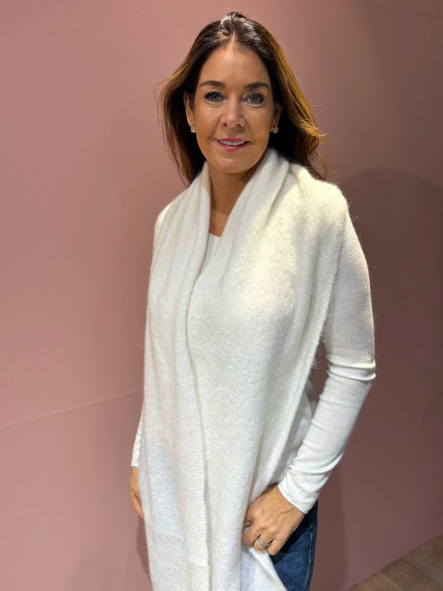 Valkoinen sävy on helppo yhdistää mihin tahansa väriin ja antaa kokonaisuudelle harmonisen, puhtaan ilmeen. Pitkä malli mahdollistaa monipuoliset käyttötavat – kiedo kaulan ympäri, aseta hartioille tai käytä sitä kerrospukeutumisen keventäjänä.
